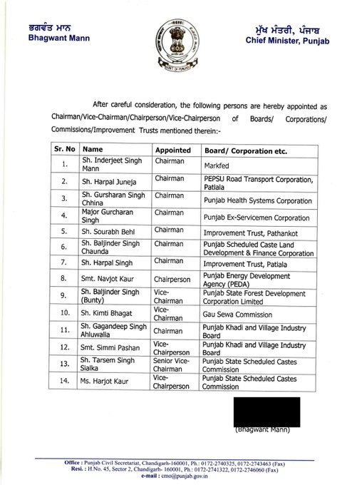 ਜਾਰੀ ਹੁਕਮਾਂ ਅਨੁਸਾਰ ਸ਼੍ਰੀ ਇੰਦਰਜੀਤ ਸਿੰਘ ਮਾਨ ਨੂੰ ਮਾਰਕਫੈਡ ਦਾ ਚੇਅਰਮੈਨ, ਹਰਪਾਲ ਜੁਨੇਜਾ ਨੂੰ ਪੈਪਸੂ ਰੋਡ ਟਰਾਂਸਪੋਰਟ ਕਾਰਪੋਰੇਸ਼ਨ, ਪਟਿਆਲਾ ਦਾ ਚੇਅਰਮੈਨ ਅਤੇ ਗੁਰਸ਼ਰਨ ਸਿੰਘ ਛੀਨਾ ਨੂੰ ਪੰਜਾਬ ਹੈਲਥ ਸਿਸਟਮਜ਼ ਕਾਰਪੋਰੇਸ਼ਨ ਦਾ ਚੇਅਰਮੈਨ ਨਿਯੁਕਤ ਕੀਤਾ ਗਿਆ ਹੈ।