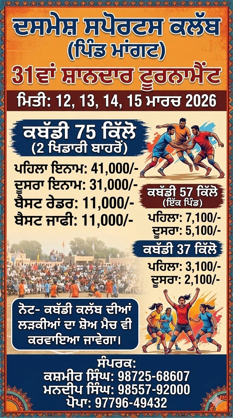 ਖੇਡਾਂ ਅਤੇ ਪੰਜਾਬੀ ਸੱਭਿਆਚਾਰ ਨੂੰ ਉਤਸ਼ਾਹਿਤ ਕਰਨ ਦੇ ਮਕਸਦ ਨਾਲ, ਦਸਮੇਸ਼ ਸਪੋਰਟਸ ਕਲੱਬ ਵੱਲੋਂ ਪਿੰਡ ਮਾਂਗਟ ਵਿਖੇ 31ਵਾਂ ਸ਼ਾਨਦਾਰ ਕਬੱਡੀ ਟੂਰਨਾਮੈਂਟ ਕਰਵਾਇਆ ਜਾ ਰਿਹਾ ਹੈ। ਇਹ ਟੂਰਨਾਮੈਂਟ 12 ਮਾਰਚ ਤੋਂ 15 ਮਾਰਚ ਤੱਕ ਚੱਲੇਗਾ, ਜਿਸ ਵਿੱਚ ਪੰਜਾਬ ਦੇ ਕੋਨੇ-ਕੋਨੇ ਤੋਂ ਚੋਟੀ ਦੇ ਕਬੱਡੀ ਖਿਡਾਰੀ ਆਪਣੀ ਖੇਡ ਦਾ ਪ੍ਰਦਰਸ਼ਨ ਕਰਨਗੇ।